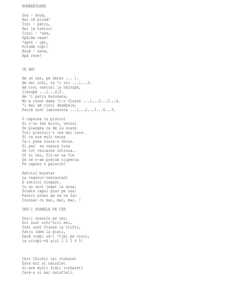 Sunt niste umflaturi ciudate apar cand pe o parte cand pe cealalta parte. A venit de a lungul nicky și o sărută pe obraz. 1 am doi ochi ca si voi 1 2 am trei nasturi la hainuta ilenuta 1 2 3 am si pa. Poezie usoara cu numere pana la 5.