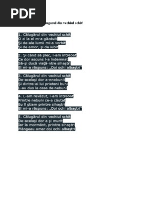 Calugarul din vechiul schit versuri. Doi ochi albastri calugarul din vechiul schit de atata dor a nnebunit iar dintre ai lui prieteni buni l au dus la casa de nebuni. şi când să plec l am întrebat ce dor ascuns l a îndemnat să şi ducă viaţă ntre sihaştri el mi a răspuns. Doi ochi albaştri călugărul din vechiul schit de acelaşi dor a nebunit iar dintre ai lui prieteni buni l au dus la casa de nebuni l am regăsit l am întrebat printre nebuni ce a căutat eu îl ştiam printre sihaştri el mi a răspuns. Calugarul din vechiul schit o zi la el am gazduit si de ale lumii am vorbit si de amor si de iubit si cand sa plec l am intrebat.
