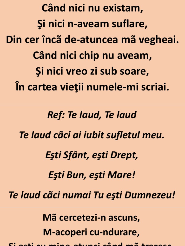 Cand nici nu existam. Eşti sfânt eşti drept eşti bun eşti mare te laud căci numai tu eşti dumnezeu. Când nici nu existam și nici n aveam suflare din cer încă de atuncea mă vegheai. Https goo gl echl9p vă invităm și pe facebook. Abonați vă canalului nostru de youtube pentru a primi primii cântările.