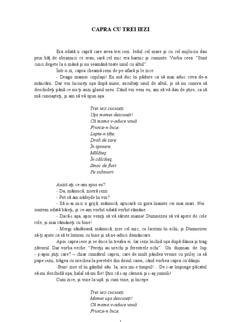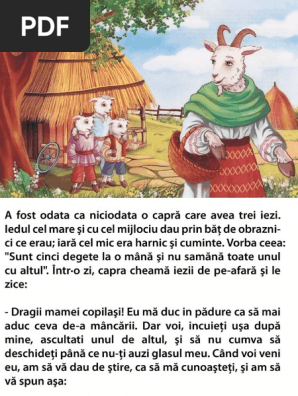 Capra cu trei iezi pdf. Eu ma duc în padure ca sa mai duc ceva de a mancarii. 11 28 2018 10 48 05 am. într o zi capra cheamă iezii de pe afară și le zice. Nici mai mare nici mai mic nici mai frumos nici mai urât.