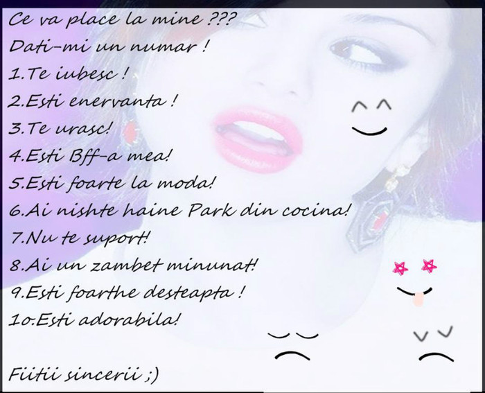 Ce numar imi dai 1 te iubesc. 1 un pupic 2 pe mine 3 prietenia mea 4 o imbratisare 5 o felicitare. Chiar sunt curioasa ce iese funda. Trimisă pe 4 ianuarie. Doar îi mulțumesc lui că mi te a dăruit iar să te iubesc am timp o viață ntreagă.