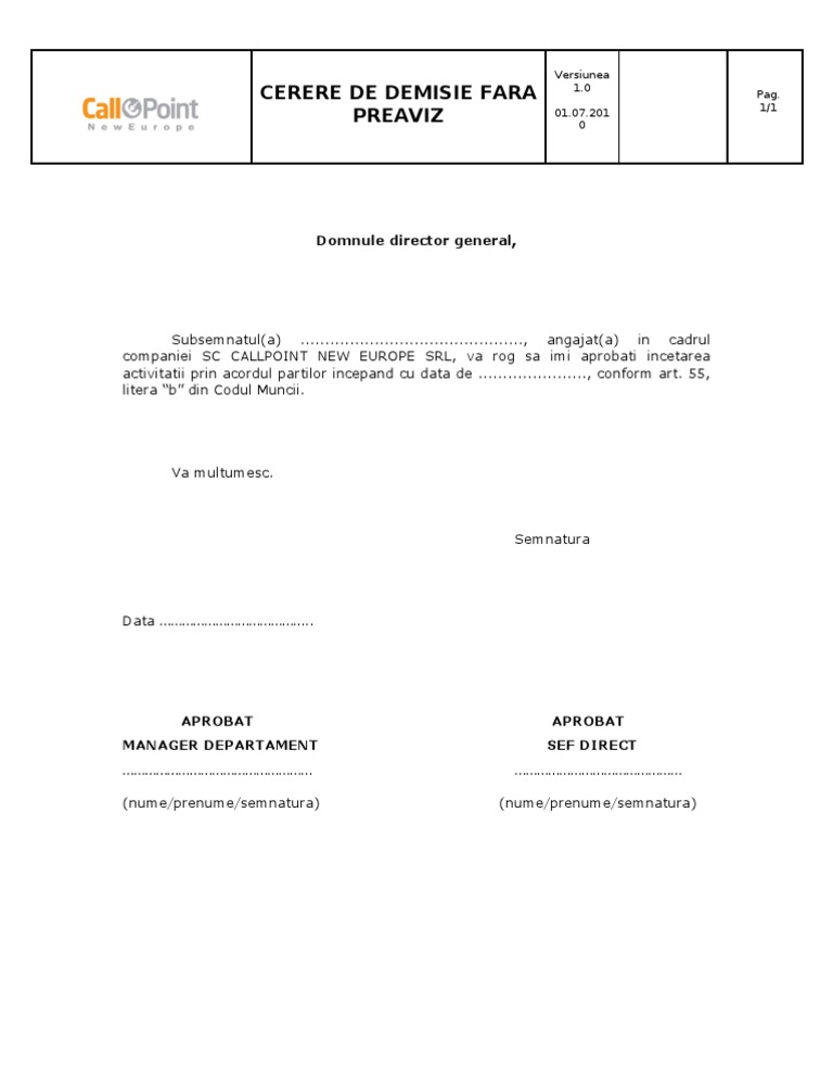 Ce se intelege prin. Cererea de demisie nu trebuie motivata si odata inaintata aceasta nu are nevoie de aprobarea angajatorului dupa cum arata prevederile din codul muncii. Acest model de cerere de demisie echivaleaza cu o demisie fara preaviz in sensul ca persoana care demisioneaza cu acordul angajatorului nu poate fi obligata la a munci in continuare in perioada de preaviz conform codului muncii actualizat la octombrie 2012. Descarca cerere demisie fara preaviz.