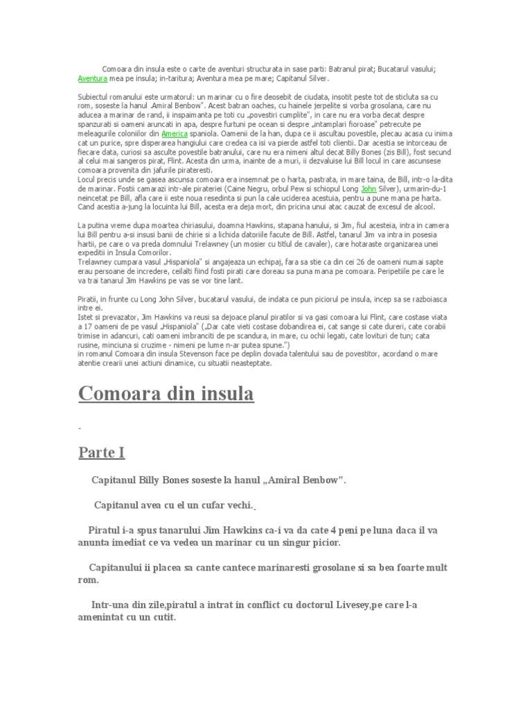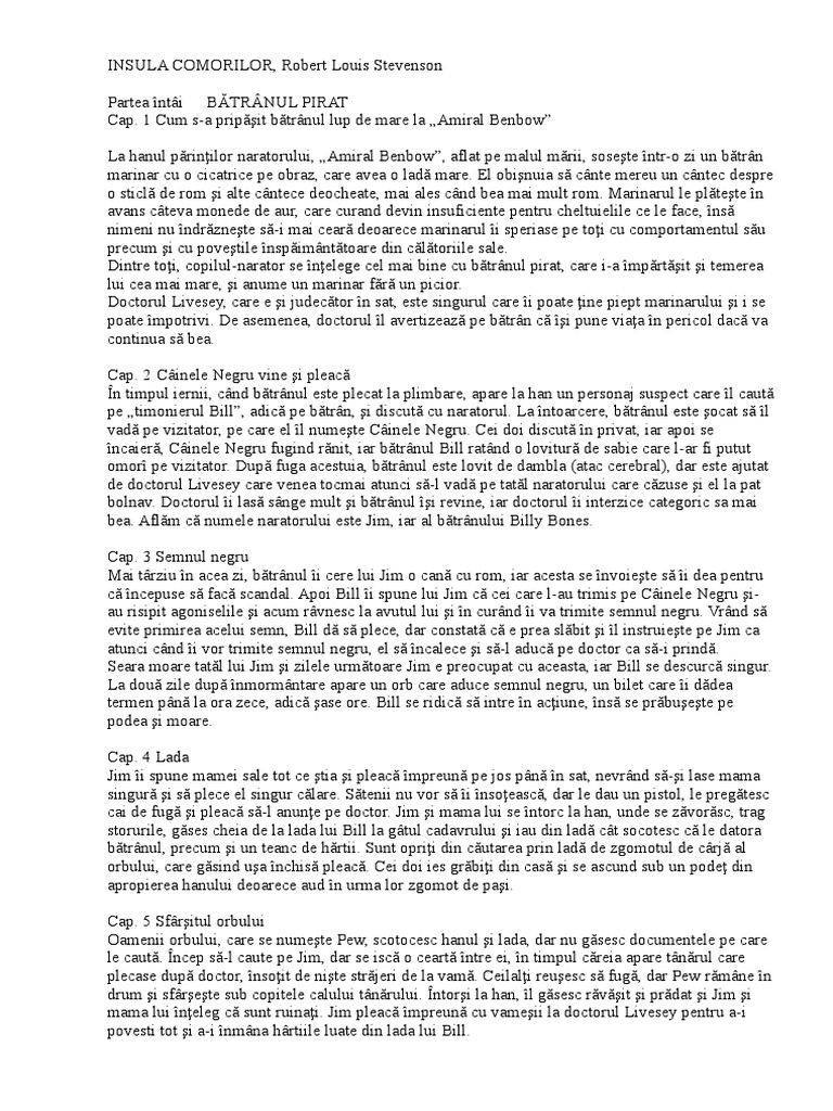 Comoara din insulă de robert louis stevenson comentariu literar rezumat literar literatură robert louis stevenson 13 noiembrie 1850 edinburgh scoţia 3 decembrie 1894 vailima samoa scriitor. Piratul i a spus tanarului jim hawkins ca i va da cate 4 peni pe luna daca il va anunta imediat ce va vedea un marinar cu un singur picior. într o zi se cază acolo un domn bătrân care fusese marinar. Comoara din insula il are ca erou pe jim un tanar de cincisprezece ani ce locuieste impreuna cu parintii sai la hanul amiral benbow.