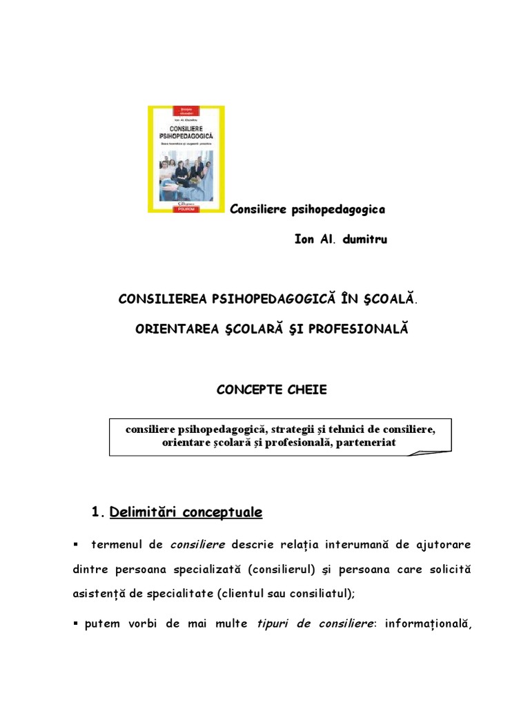 Consiliere psihopedagogica ion al dumitru pdf. Curriculum vitae ion al dumitru. Baze teoretice si sugestii practice scrisa de ion al. Baze teoretice si sugestii practice. Structurata ca un suport de curs pentru consilierea psihopedagogica lucrarea ofera o privire de ansamblu asupra intregii tematici a disciplinei de la tipurile de consiliere la formarea consilierilor si aspectele deontologice ale profesiei.