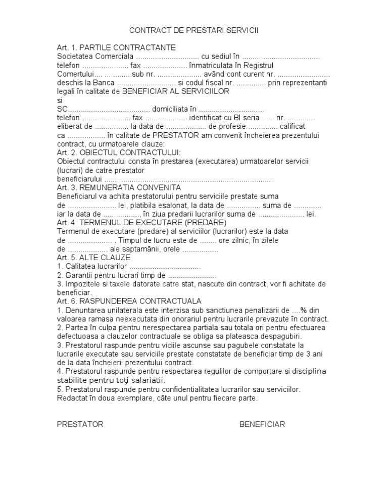 Contract de prestari servicii persoana fizica. In ceea ce priveste obiectul contractului acesta este de furnizare in nume propriu si pe cheltuiala sa de servicii de intermediere privind semnarea antecontractului de vanzare cumparare imobil. Contractui de prestari servicii este contractul prin care o parte denumita prestator se obliga sa presteze anumite servicii unei alte parti denumite beneficiar in schimbul unui pret. Ataşament mărime hits last download. Este reglementat in raport de activitatile specifice consultanta turism activitate de service constructii montaj transport etc.