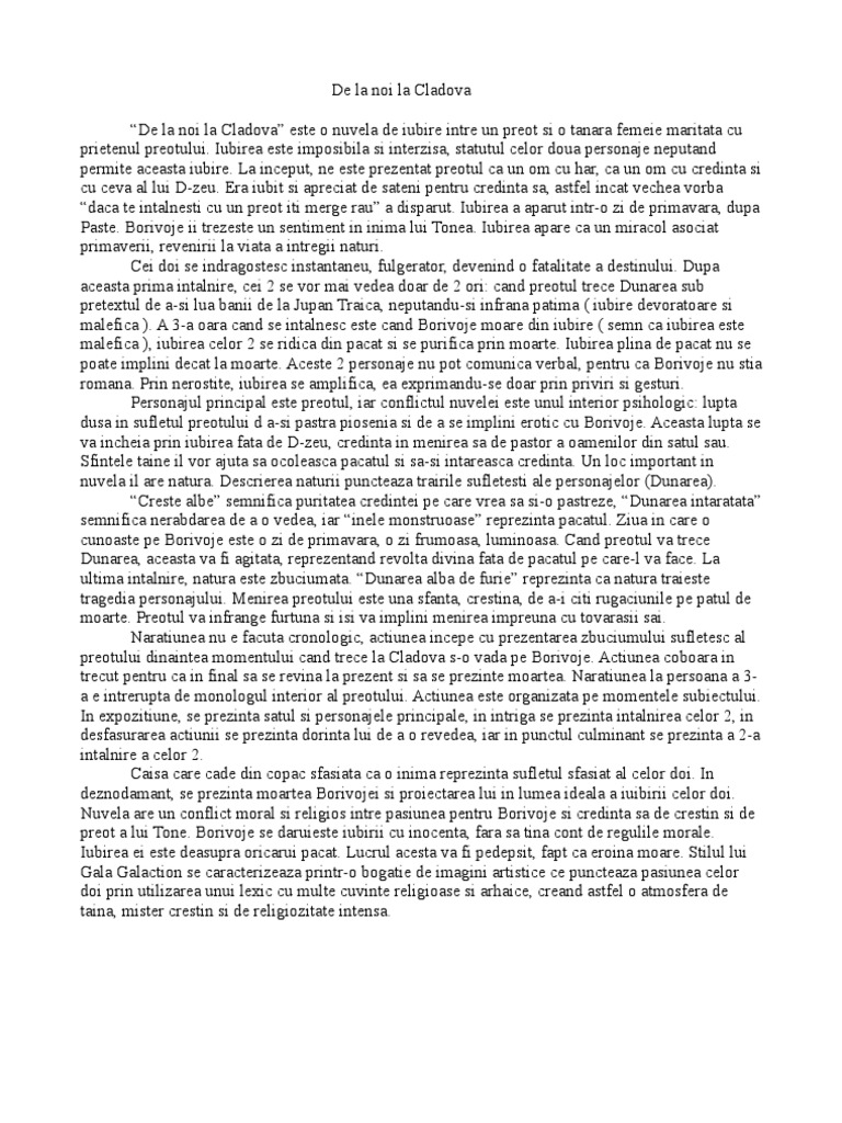 25 martie 2010 17 08. Ipostaze ale iubirii gala galaction pseudonimul literar al lui grigore pişculescu n 16 aprilie1879 dideşti teleorman d 8 martie 1961 bucureşti a fost un scriitor preot ortodox profesor de teologie român tema nuvelei este iubirea o iubire nebunã declanşatoare de evenimente titlul de la noi la cladova reprezintã spaţiul în care are loc desfãşurarea unor suspine şi. Nuvela este o specie a genului epic cu un singur fir narativ cu un conflict puternic iar personajele puţine la număr sunt caracterizate succinct în funcţie de contribuţia lor în desfăşurarea acţiunii. Baba novac luptasã la dunãre cladova pe timoc ºi la dii cu turcu ºi cu taifa lui de haiduci 3.