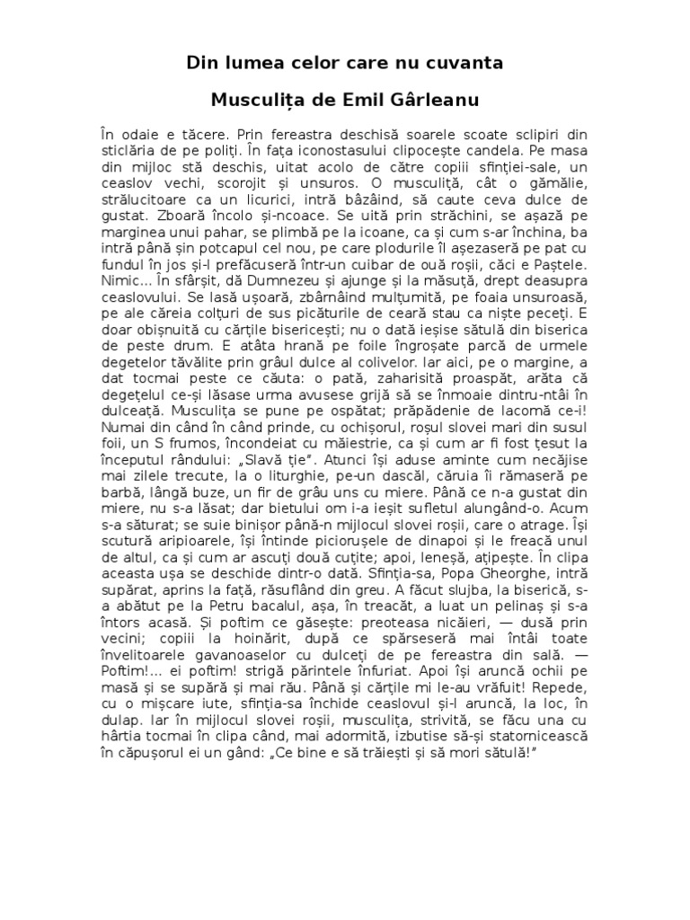 Avem o baza de date care creste pe zi ce trece si suntem siguri ca daca nu acum in viitorul apropiat cu siguranta o sa adaugam referatul rezumat din lumea celor care nu cuvanta de emil garleanu. Din lumea celor care nu cuvanta n7e20ee 1884 spre 5 ianuarie se naste la iasi emil unul dintre cei sase copii ai serdarului dinca garleanu si ai pulcheriei n. Din lumea celor care nu cuvanta rezumat din lumea celor care nu cuvanta marinimie de emil garleanu fire visătoare dotat cu o sensibilita 2 michael faraday din lumea celor care nu cuvanta rezumat din fierarie. Trei vedenii 1910.