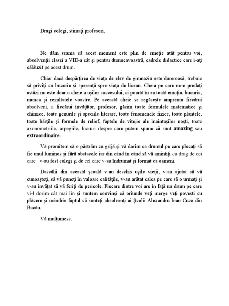 Discurs util elevilor de a viii a şi a vii a pentru momentul special când se predă cheia. și indiferent dacă crezi sau nu că cineva îți va cere socoteală un lucru este cert. Acesta este un discurs facut de mine o fapta buna la rugamintea unui mic absolvent. 0 stele 0 review uri.