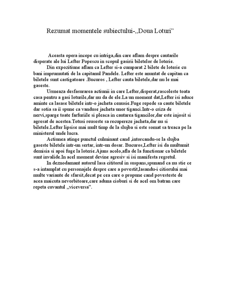 Doua loturi rezumat scurt. în scrierea rezumatului pe scurt trebuie să ai grijă să respecți ordinea din text intriga fiind de data aceasta amplasată înaintea expozițiunii. De trei zile domnul lefter popescu caută prin casă doua loturi. Primul capitol este intitulat iapa lui voda. Uita te mai jos si o sa gasesti cele mai relevante rezultate pentru cautarea rezumat pe scurt doua loturi.