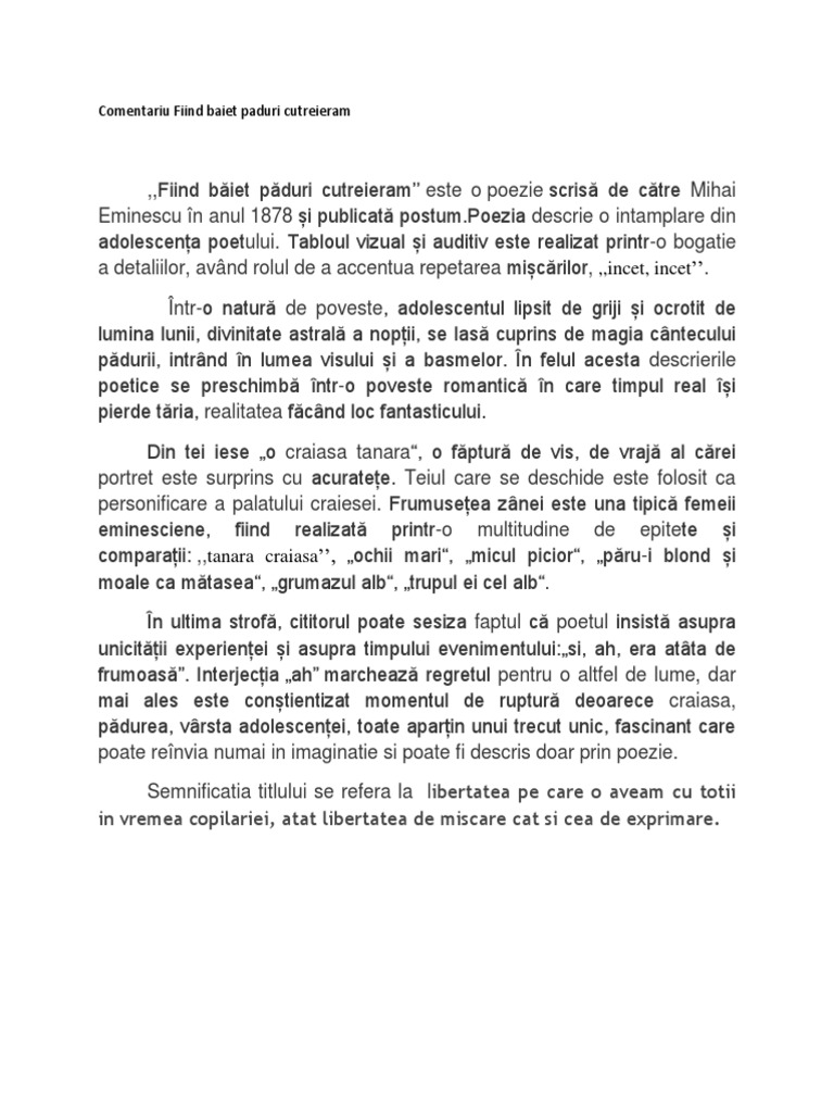 31 august 2012 22 55. Fiind băiet paduri cutreieram rezolvă testul fiind băiet paduri cutreieram pe platforma educațională kidibot. Un freamăt lin trecea din ram în ram şi un miros venea adormitor. Titlul unei creații literare nu este niciodată ales la întâmplare ci tocmai pentru a însuma ceea ce este mai important de reliefat în opera respectivă.