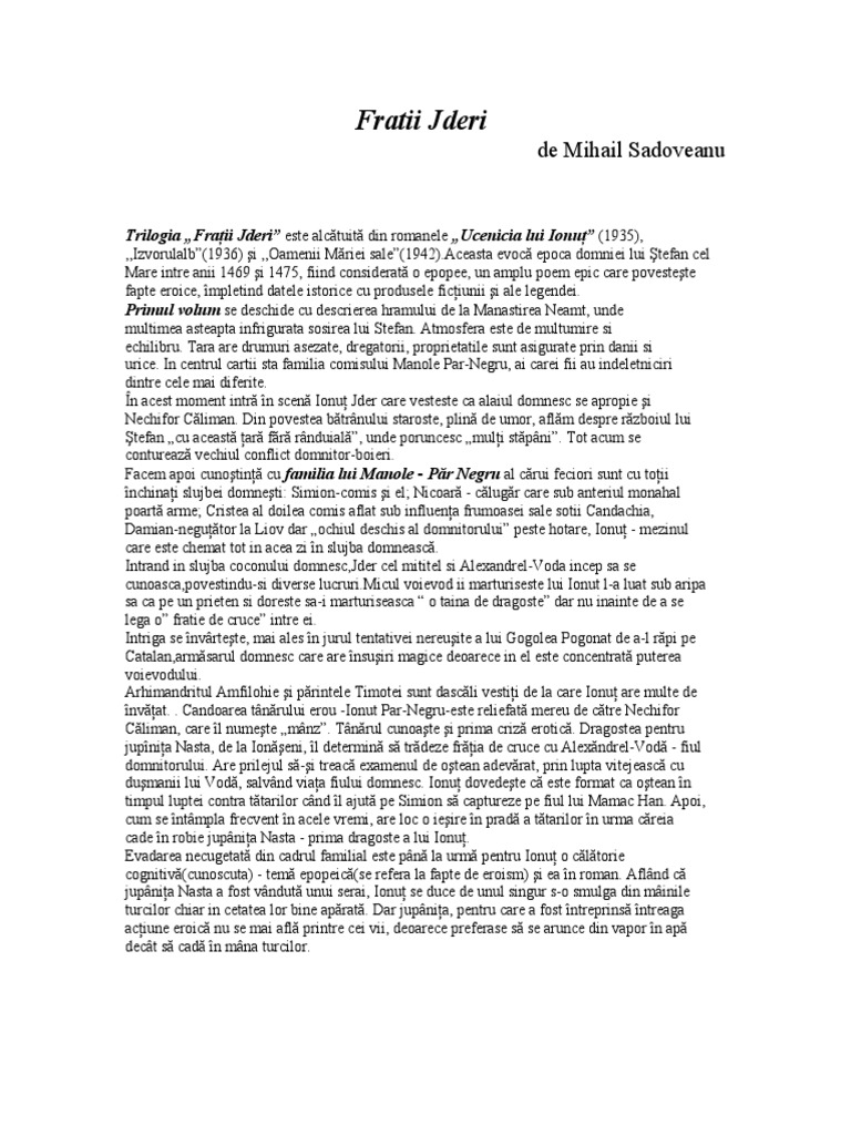 Fratii jderi volumul i debuteaza cu ceremonialul ce va avea loc la manastirea neamtului privejduit de hramul manastirii si de sosirea lui voda 1469 oameni sunt nerabdatori sa l vada pe stefan iar unii dintre ei se intreaba daca domnitorul se va ingriji de interesele tarii. Puteti gasi foarte multe referate accesand categoriile din partea dreapta despre rezumat fratii jderi volumul 1. Rezumatul pe volume și capitole bazat pe ideile principale ale povestirii frații jderi în care este vorba despre membrii familiei jder din timpul domniei lui stefan cel mare. Fratii jderi de mihail sadoveanu rezumat fraţii jderi ucenicia lui ionut fraţii jderi roman istoric epopeea domniei lui stefan cel mare in romanul fratii jderi de mihail sadoveanu.