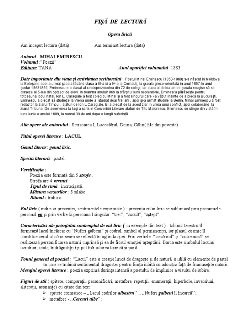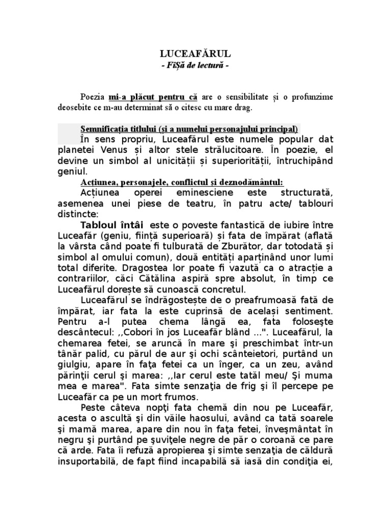 Luceafarul fisa de lectura. Din basmul popular miron si frumoasa fara corp m. Mult mai mult decât documente. Accesează fisa de lectură pentru poezia lacul de mihai eminescu și vei ști cum trebuie structurat un astfel de material și care sunt informațiile pe care nu trebuie să le omiți. 0 stele 0 review uri.