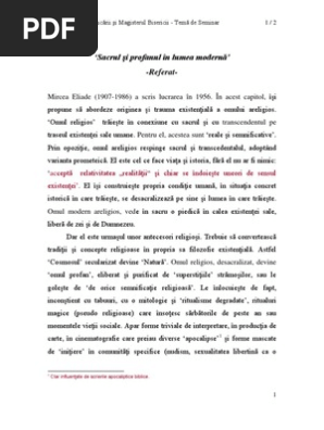 P i sacrul şi profanul i sunt două modalităţi de a fi în lume două situaţii existenţiale asumate de om de a lungul istoriei sale. Mircea eliade bucureşti 28 februarie 1907 chicago 22 aprilie 1986 a făcut studii de filozofie la bucureşti încheiate cu o teză despre filozofia renaşterii 1928 şi la calcutta india decembrie 1928 decembrie 1931. Succesul se datora fără îndoială perspectivei noi şi originale propuse de autor. Ele nu prezintă interes doar pentru istoria religiilor sau pentru sociologie nu fac doar obiectul unor studii istorice sociologice etnologice.