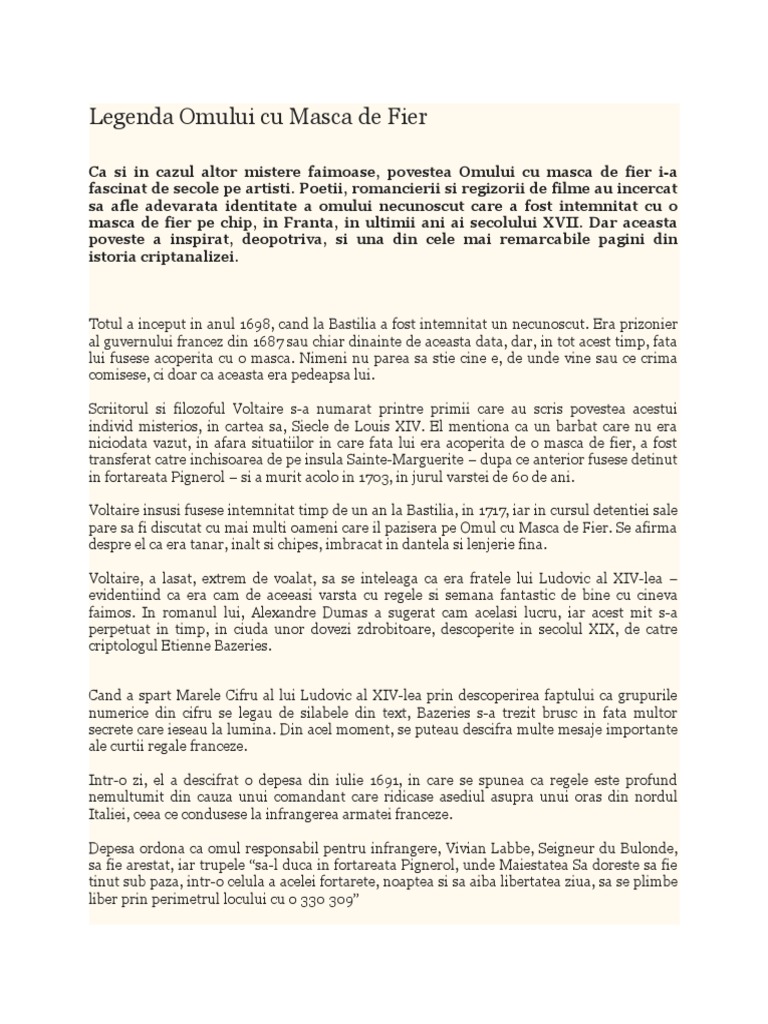 2aramis ştie un secret uluitor şi are un plan îndrăzneţ pe care vrea să l ducă până la capăt. Repovestire după romanul lui alexandre dumas. Peste aproximativ patru ani prizonierul enigmatic se stinge din viaţă provocând uimire cât şi unele actiuni care pot sugera dorinţa de a scăpa de urmele acestuia înmormântarea are loc în grabă certificatul de deces este. Uita te mai jos si o sa gasesti cele mai relevante rezultate pentru cautarea omul cu masca de fier rezumat.