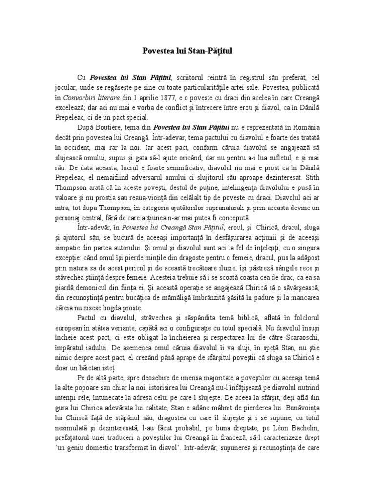 Povestea lui stan patitul analiza literara de ion creanga ion creanga povestea lui stan patitul ceea ce surprinde la diferite lecturi pe cititorul avizat al basmelor lui creanga este mai inainte de orice realismul lor caracterul de nuvela in intelesul vechi al cuvantului din viata taraneasca de altadata.