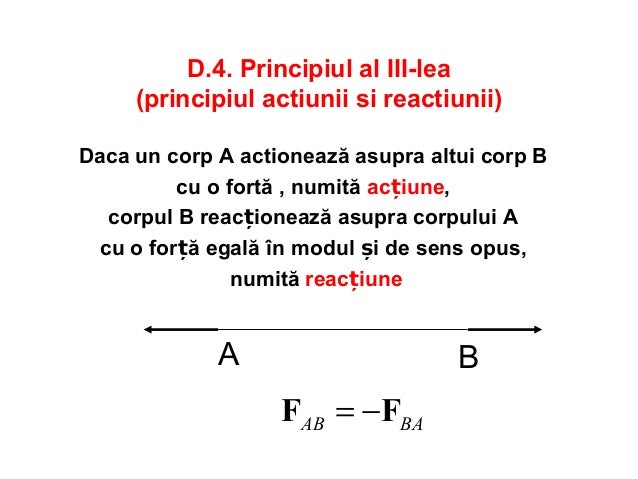 Principiul al ii lea al dinamicii se enunta astfel vectorul forta este egal cu produsul dintre masa corpului si vectorul acceleratie. Principiul al iii lea al dinamicii principiul actiunii si reactiunii conform celui de al treilea principiu al dinamicii pentru oricare doua corpuri punctiforme a si b aflate in interactiune forta cu care unul dintre ele actioneaza asupra celuilalt este egala si de sens contrar cu forta exercitata de al doilea corp asupra primului. Variatia in timp a impulsului unui corp punct material reprezinta o masura a influentei interactiunilor exercitate asupra corpului respectiv adica a fortei. Un corp își păstrează starea de repaus relativ sau de mișcare rectilinie și uniformă atâta timp cât asupra lui nu acționează alte corpuri din afară.