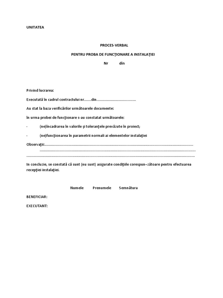Proces Verbal Pentru Proba De Functionare A Instalatiei