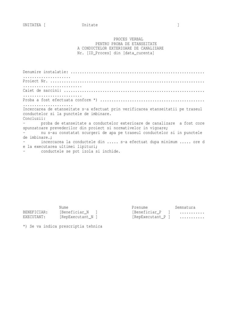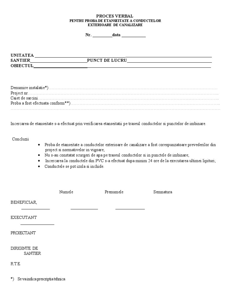 Proces verbal pentru proba de functionare a instalatiei. 0 0 voturi pozitive. Editarea mutarea si clonarea instalatiilor. Controlul calităţii lucrărilor de instalaţii. Proces verbal pentru efectuarea probei pentru incercare de etanseitate la presiunea la rece.