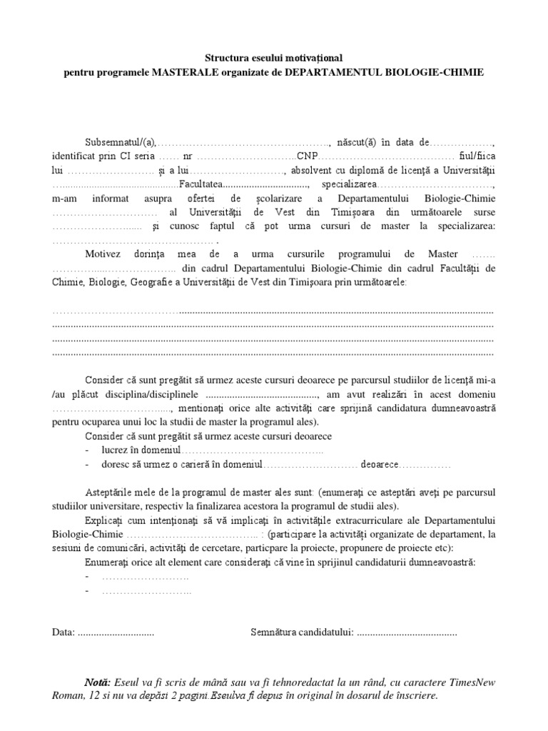 Biologie biochimie biologie ambientală sau științe inginerești aplicate biotehnologii industriale ale facultății noastre max. De altfel încă din timpul facultății am participat la activități de voluntariat. Modelul scrisorii de motivaţie pentru candidatura la studii nivel licenţă facultatea de sociologie și asistenţă socială universitatea babeș bolyai cluj napoca sursa exactă trebuie marcată între paranteze nume și prenume autor an apariţie text titlul textului editura localitatea. Pagină nu.