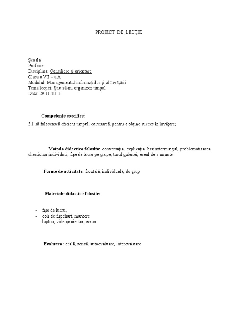 Proiect de lectie pentru dirigentie clasa a vii a. Cu totii avem 24 de ore insa uneori simt ca nu mi ajunge timpul. Cum sa imi organizez timpul. Stiu sa mi organizez timpul de elev.