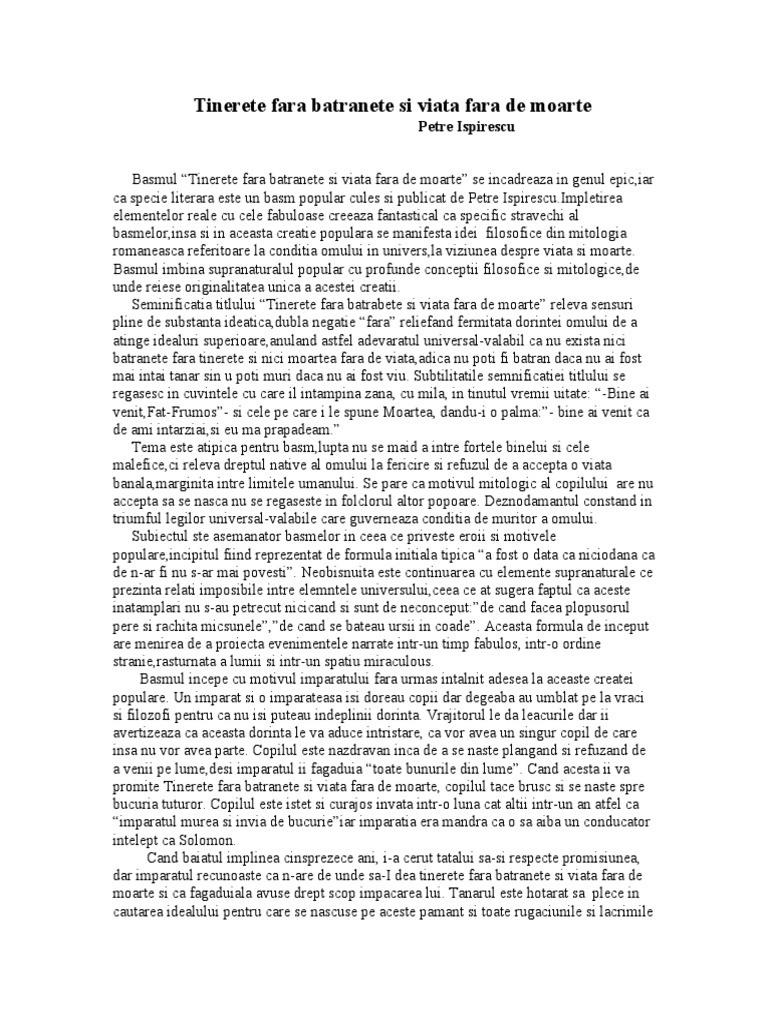 De ce creştea copilul d aceea se făcea mai isteț şi mai îndrăzneț. Conceptia despre viata si moarte locul si rostul omului in univers sensul si limitele fericirii. Tinerete fara batranete si viata fara de moarte aceasta precizare fixeaza locul basmului in contextul literaturii si al culturii noastre si nu numai din perspectiva implicarii in el a unor elemente din filosofia folclorica romaneasca mioritica conceptia despre viata si moarte locul si rostul omului in univers sensul si limitele fericirii. Aceasta casa este incongiurata cu o padure deasa si inalta unde stau toate fiarele cele mai salbatice din lume.