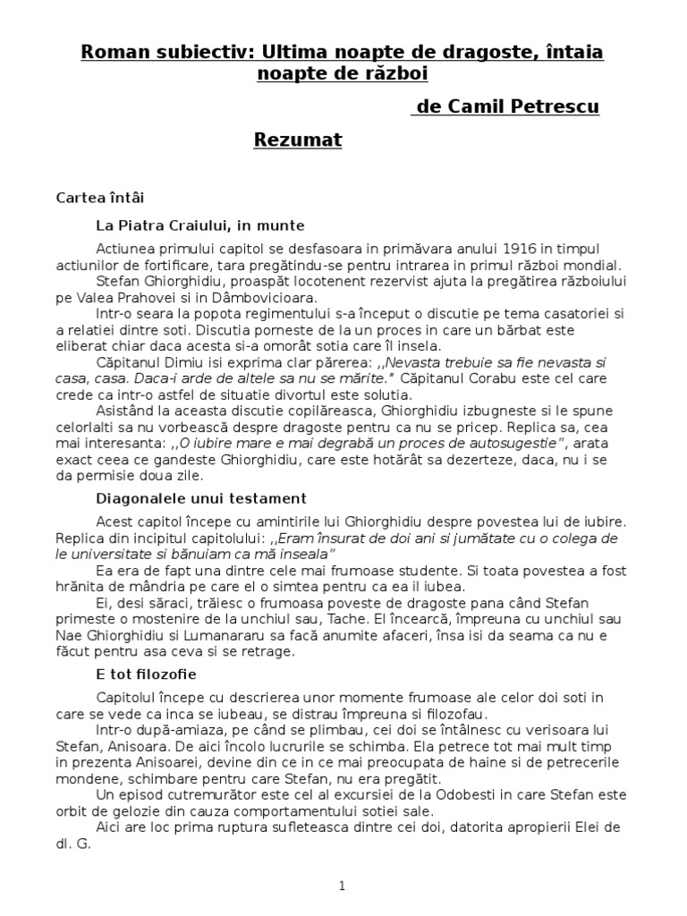 Ultima noapte de dragoste ntaia noapte de rzboi de camil petrescu cartea nti la piatra craiului in munte actiunea primului capitol se desfasoara in primvara anului 1916 in timpul actiunilor de fortificare tara pregtindu se pentru intrarea in primul rzboi mondial. Cartea11 la piatra craiului in munte2 diagonalele unui testament3 e tot filosofie4 asta i rochia albastra5 intre oglinzi paralele6 ultima noapte de dragoste cartea 2 1 intaia noapte de razboi 2 fata cu obraz verde la vulcan 3 intamplari pe apa oltului 4 post inaintat la cohalm 5 nea acoperit. O adunătură de pe stradă. Un rezumat scurt de aproape o pagina si un rezumat pe capitole de 3 pagini la romanul de dragoste ultima noapte de dragoste întaia noapte de război.
